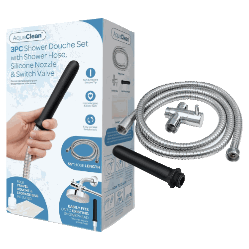 Feel a clean like never before with AquaClean’s shower-friendly douche system that’s compatible with most shower heads to transform your intimate cleansing experience. Enjoy discreet and convenient cleansing that seamlessly integrates into your daily routine. The hose measures 55″ long for optimal positioning and the easy to install switch valve ensures that you can still use your existing showerhead. The set also includes a travel-friendly compact douche and storage bag for on-the-go clean. *Showerhead NOT included