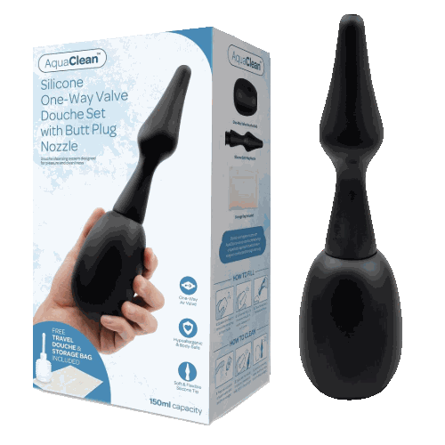 Indulge in the pleasure of feeling fresh and clean with AquaClean’s douche featuring a unique butt plug nozzle. This design does double duty ensuring a thorough and comfortable cleansing, providing you with a superior level of freshness and confidence. The one-way valve prevents water backflow into the douche bulb, which holds up to 5 fluid ounces (150ml). The set also includes a travel-friendly compact douche and storage bag for on-the-go clean.
