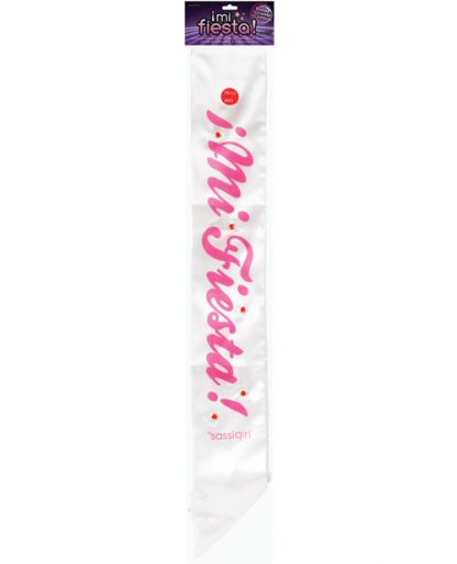 Mi Fiesta Bande Luciente be the girl that lights up the room. Five blinking red lights and dark pink lettering on a white sash. Flash your sash! Se el alma de la fiesta! Cinco luces rojas que destellan con letra de color rosa obscuro en una bella banda blanca. Es hora de brillar! Fiesta con las amigas. Fiesta de cumpleanos. Fiesta de divorcio. Sassigirl!