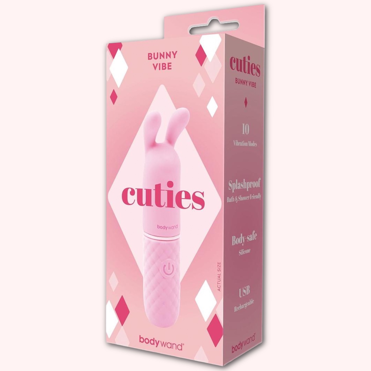 The Cuties Bunny Vibe features a pair of bunny ears on its tip that deliver powerful sensations all over the body. Let this cute companion whisk you away to ecstasy! The Bunny Vibe offers powerful pleasure in a compact size thanks to its ten vibration modes and is splashproof.