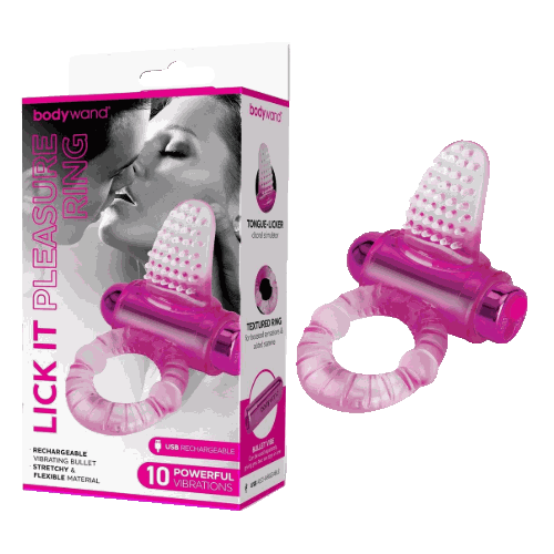 The Bodywand Rechargeable Lick It Pleasure Ring features a 10 powerful vibrations and a textured tongue-shaped external stimulator for heightened sensations. Enhance partner play with this discreet, versatile pleasure device. The textured ring is great for mutual pleasure, and the USB rechargeable bullet vibe can be used separately, giving you two sex toys in one!