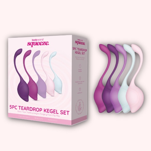 Crafted from high-quality, body-safe silicone, this Bodywand 5PC Teardrop Kegel Set is your key to a more empowered and pleasurable life. The set includes five weighted training balls, ranging from 37g to 115g, making it ideal for individuals of all levels. Unlock enhanced pelvic strength and intimate satisfaction with this premium Bodywand Squeeze 5 Piece Teardrop Kegel Set.