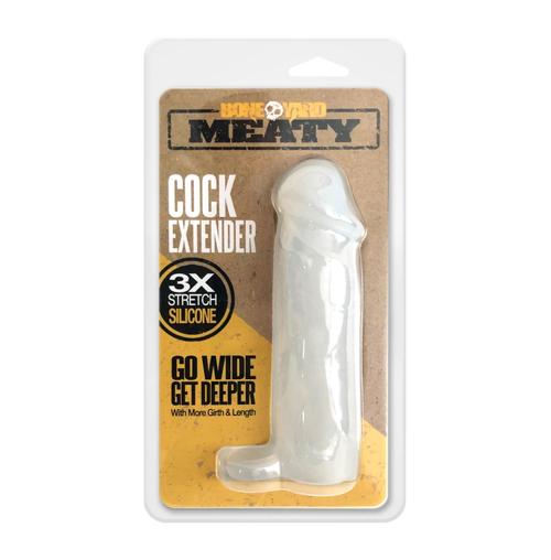 The Boneyard Meaty cock extender is made of 100% soft touch silicone. It adds 2 inches in length and 1/2 inch in girth. The added cock ring keeps it in place and adds extra sensation. To use, apply lubricant to cock and insert into the extender, stretch the cock ring around your balls and go! A thinner bottom layer allows for full sensation, the 3X stretch makes it easy to put on.