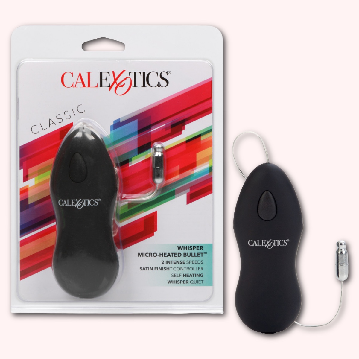 Whisper quiet, soft Rubber-Cote, 2-speed micro-bullet heats up with powerful vibrations. Ergonomic battery pack with EZ push button control. 2 AA batteries.