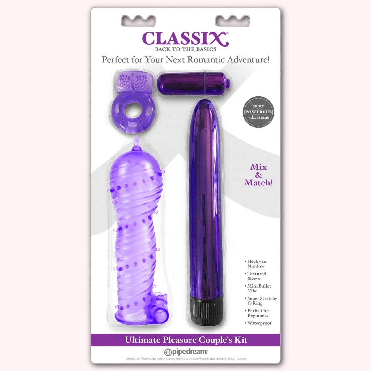Enjoy exciting variety and endless versatility with the ultimate couple’s kit! All four classic favorites can be used together or separately. The slimline 7” multi-speed vibe can be paired with the ultra-stretchy textured sleeve and powerful bullet for your own super-stimulating rabbit. Try placing the C-ring around his shaft or balls, with or without the vibrating bullet, for thrilling sex play. The possibilities are endless for hours of sexy partner play!