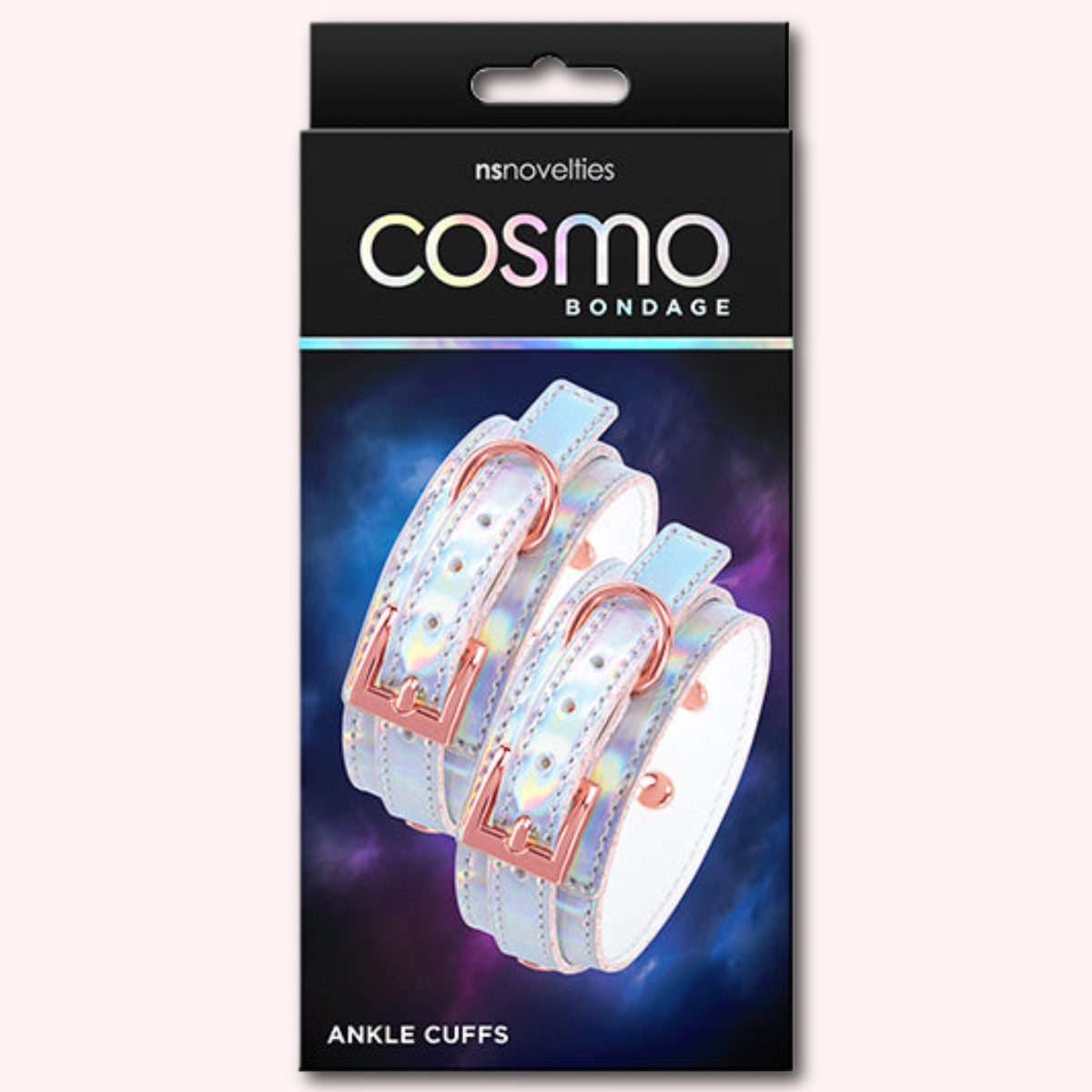 Light up the night with Cosmo’s holographic ankle cuffs. Accented with Rose Gold nickle free hardware and fully adjustable for universal fit. Made from easy to clean Vinyl.
