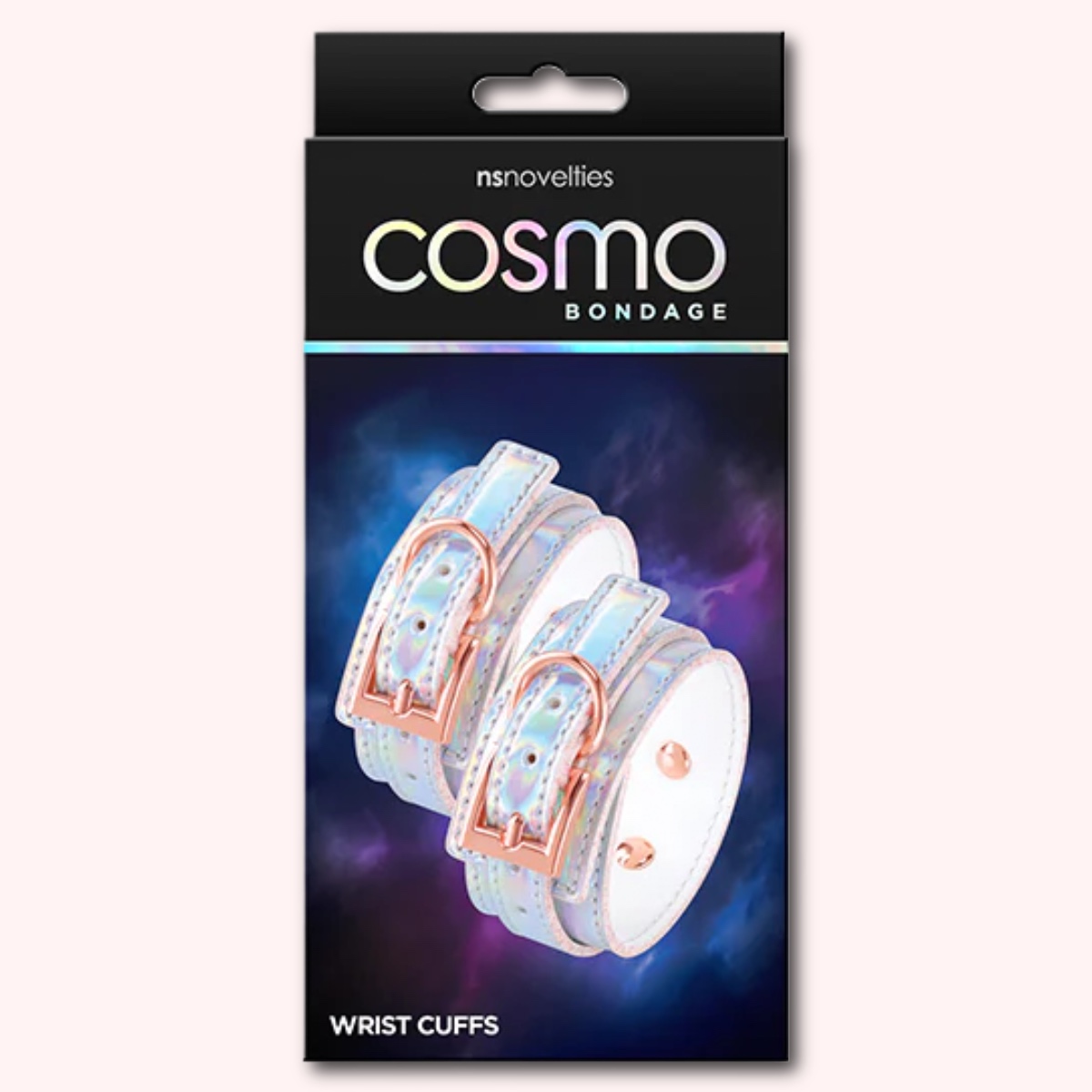 Light up the night with Cosmo’s holographic wrist cuffs. Accented with Rose Gold nickle free hardware and fully adjustable for universal fit. Made from easy to clean Vinyl.