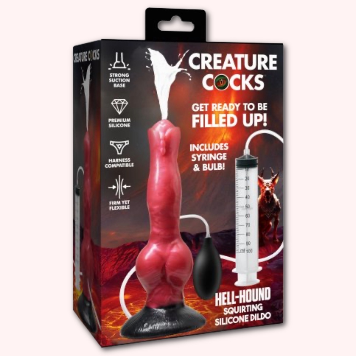 Unleash your desires with the Fantasy Hell-Hound Squirting Dildo! Its bold red design is a masterpiece, featuring a smooth yet veiny surface that perfectly mimics a fiery canine form. Highlighted by its knotted base, this shiny marvel promises unforgettable sensations. For an added thrill, use the connected tube and pump to simulate lifelike squirting of any fluid you choose. The syringe holds an impressive 100 mL of liquid, easily filling the 56 mL bulb for customizable fun. Made from premium, body-safe silicone, it’s flexible and bendy so it can fit comfortably in any entry. Perfectly designed with a wide base for compatibility with most strapon harnesses, this is a toy like no other!