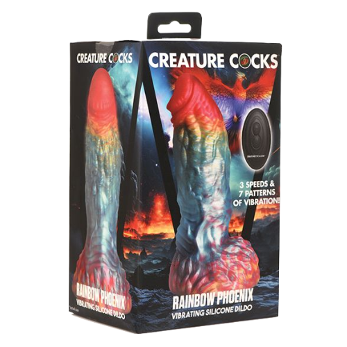 This massive, iridescent, rainbow-colored dong is inspired by the mystical firebird known as the phoenix! It has a large, tapered head, the veiny shaft is covered in feathery and mystical bumps, ridges, and textures that add delightful sensation, and the wide base has a strong suction-cup for hands-free rides! Get buzzed with the powerful vibrator that is nestled inside and choose between 3 speeds and 7 patterns of vibration that you control with the battery-operated remote! Made out of premium, phthalate-free silicone, this dong is body-safe and best used with water-based lubricants only. Use it in fantasy roleplay, kinky cosplay, and steamy self-love sessions! The soft but squishy material is also waterproof, rated as IPX6 so it can be taken in the shower but not submerged underwater. To recharge the vibrator, connect the magnetic end of the charger to magnetic points on the base of the dildo, then connect to the USB port or adapter. Power button flashes while charging. Remove from charger promptly once fully charged. Replace the remote’s battery as needed. To clean, wash with warm water and mild soap, then rinse it off and spray with a toy cleaner. Pat dry and let it air out. Store out of direct sunlight or heat. Keep separate from other silicone toys.