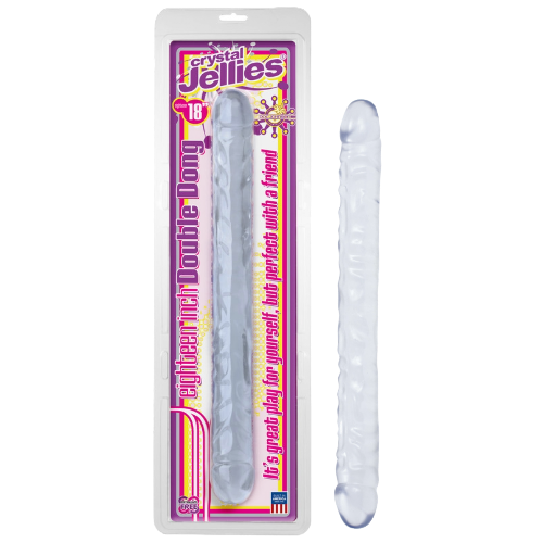 Doc Johnson’s 18″ Crystal Jellies Double Dong is a soft and flexible variation of the original dong that started it all. This double-ended cock has the traditional thickness and veiny texture we all know and love, plus a flexible shaft and glistening color options! Available in Pink, Clear and Purple. All of our Crystal Jellies are from phthalate-free body-safe material and are Proudly Made in America.