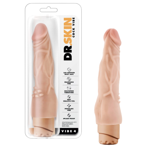 The doctor is in! Blush Novelties Dr. Skin Vibe #4 is an 8 inch realistic vibrator with clitoral nubs and twist dial base for multi-speed vibration. It’s tapered head and thin shaft can be comfortably and easily inserted. Created for the beginner and for the cost conscious, Vibe #4 is made of phthalate free PVC which is comfortably soft yet rigid for vigorous play. Vibe #1 is powered by 2 AA batteries, not included.
