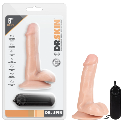 Dr. Spin is ideal for those of us who love the fullness and intense sensation of a gyrating, spinning shaft and head! Massage your G spot or prostate with 7 thick inches of vibrating realistic cock and balls. You’ll also enjoy a harness compatible, suction cup base that allows endless, creative play possibilities. Alone or with your partner, Dr. Skin™ is ready to indulge you in any fantasy. Made of non-porous PVC, Dr. Skin is free of phthalates, paraffins, and latex. Dildo is waterproof submersible for easy cleaning and play in the bath or shower (controller is not waterproof). Requires 2 AA batteries (not included).