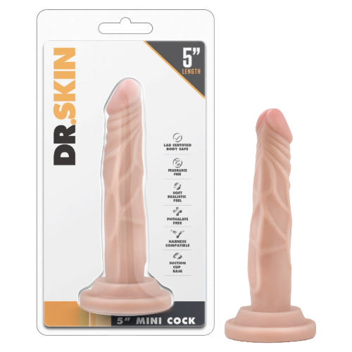 The doctor is in! The Dr. Skin 5 Inch Mini Cock is perfectly sized for anyone who likes it a little smaller. Featuring a slim shaft but average length, the Mini Cock is designed for easy insertion. This dildo is hand-sculpted to look and feel like the real thing. The suction cup base will stick to almost any smooth, flat surface and is harness compatible. The Dr. Skin Mini Cock is designed for solo play, partner play, pegging, and any kind of penetration. Its size means it’s ideal as a first-time dildo purchase! Made from body safe TPE, the Mini Cock contains no fragrances, phthalates, paraffins, or latex.