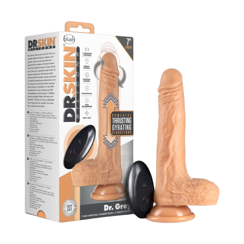 Enhance your pleasure with the push of a button with Dr. Grey. This incredibly realistic dildo has 50 unique settings, 5 speeds and 10 thoughtfully created patterns per speed! It has full vibrating, thrusting, and gyrating power you can control from both the toy or the wireless remote control to bring you true versatility during play! Dr. Grey is splashproof and is easy to clean. It’s also USB rechargeable with cable included. Dr. Grey has a powerful suction cup that secures to most flat, clean surfaces and is harness compatible. Made of platinum-cured silicone, Dr. Grey also has a silky smooth feel, it’s body-safe, phthalate free, and latex free. The Dr. will see you now!
