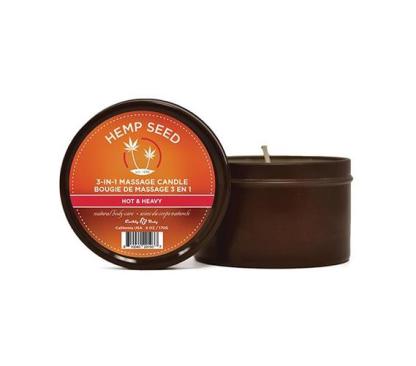 Earthly Body 2021 Summer 3 in 1 massage candle collection. The 100 % natural blend of hemp seed and cosmetic-grade oils absorb to soften and condition your skin. 100% Vegan. No animal testing. Paraben free. Gluten Free. 6 ounce round tin. Hot and Heavy – Smells like Yuzu, lavender, white cedar.