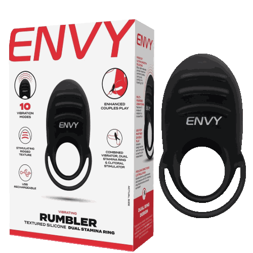 Elevate you and your partner’s confidence and satisfaction with the Rumbler’s stretchy, vibrating ring that constricts the shaft & balls, while its external ridges and vibrations target your partner’s erogenous zones. Featuring ten vibration modes, the innovative dual-ring design also offers tantalizing constriction and simultaneous stimulation. The Rumbler is also USB rechargeable and comes with a convenient storage bag.