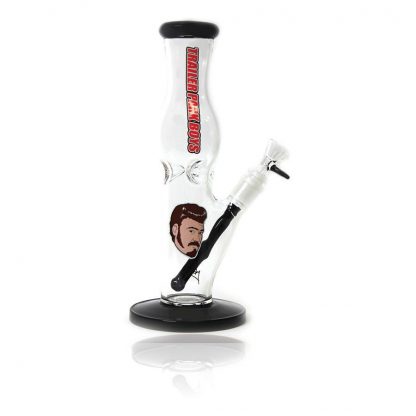 This solid borosilicate glass ice bong is ideal for sharing with friends at a party and it makes a great gift and collectable. The lower section of the body features a signed image of Ricky’s face and the upper section of the body is decorated with Trailer Park Boys logo. Black glass accents can be found the herb bowls handle, on the downstem, on the circular foot and on the rimmed mouthpiece.