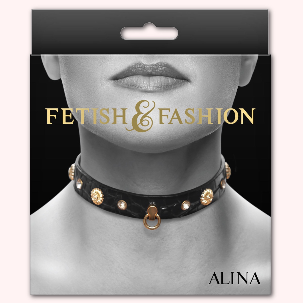 Fetish & Fashion’s Alina Collar is perfect for a submissive lover. Designed for neck sizes from 11.5 to 17.5 inches and garnished with crystal gems and golden sun charms, Alina features an adjustable buckle closure and O-ring for a tether or leash.