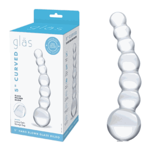 The Curved Glass Beaded Dildo from gläs is an artisinally crafted, gorgeously designed adult toy made of hypoallergenic, borosilicate glass. This clear, elegantly made product is intended for extensive, long lasting use and is compatible with all varieties of lubricants. It is easy to clean with a dash of water and soap. This gläs pleasure product is handmade in a specially designed beaded shape to illicit massive arousal and release. It is 5 inches in total length and has a slight bend in its shaft for natural feel and comfortable insertion. The Curved Glass Beaded Dildo retains warmth as well as coldness for versatile and adaptable bedroom action. Gläs products are exceptional in their design and handcrafted to perfection. Whether on display or used during play, the Curved Glass Beaded Dildo is irresistible and unforgettable.