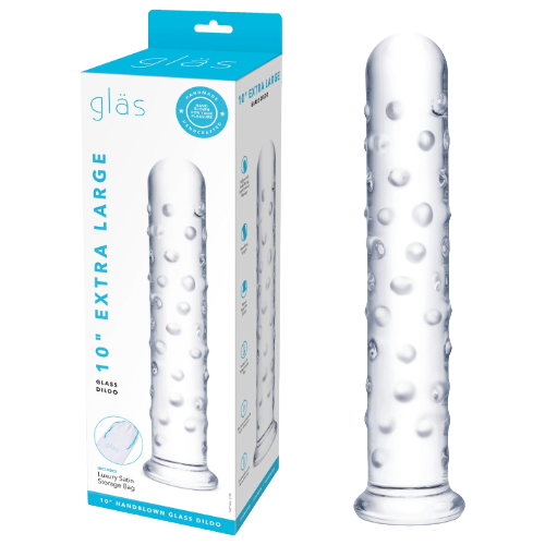 Enjoy deep penetration and larger than life orgasms from this 10-inch lustrous glass dildo featuring ridges all along the shaft that provide massage thoroughly, hitting all of the areas that desire it the most. The smooth tapered tip makes this extra-large dildo easy to insert as its elongated size provides optimal reach.