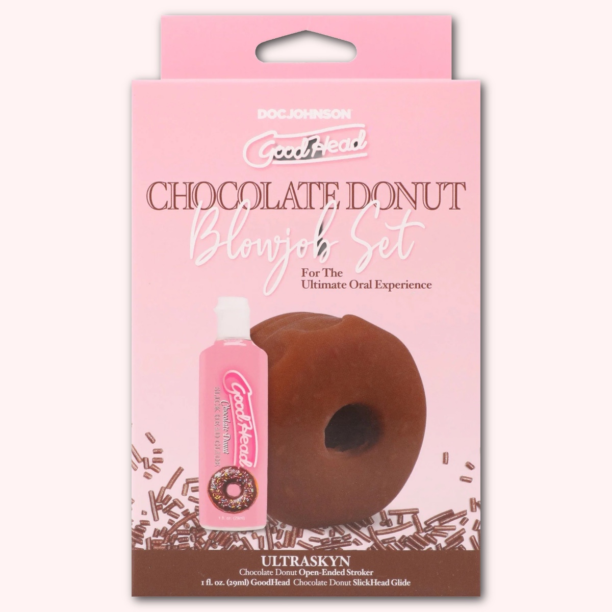 No need to run to the corner shop! This adorable open-ended donut stroker has a tight, textured interior made from ULTRASKYN, for the ultimate feel. It includes a 1 fl. oz. bottle of Chocolate Donut-flavored GoodHead Slick Head and ULTRASKYN Refresh Powder to keep it fresh and ready.