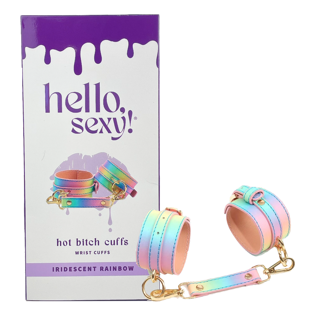 They call you “Hot Bitch” because you’re self-assured. You’re confident AF, and maybe that scares them. Let’s face it: You’re adventurous. You know exactly what you like, and how you like it. But babe, we GOT you. Our Hot Bitch cuffs are a perfect pastel addition to your pleasure arsenal. Each cuff is carefully crafted in our supple vegan faux leather, with sensuously soft suede-textured inner lining– just running our fingertips along these cuffs makes us feel some type of way. Like the hairs on the backs of our arms just stand up in the very BEST way possible. They also feature fully adjustable buckle and eyelet strap-closures, and the straps are extremely accommodating and comfortable for continuous wear. And the color, babe, the color! The signature iridescent rainbow pastel gradient on the Hot Bitch leatherette cuffs is supernaturally gorgeous, and everything is cinched together with gold-toned chain links. Hot Bitch cuffs are a great all-rounder intimate accessory: the perfect power jewelry for experienced vixens, or adventurous new-cummers entering their first foray into the mysteriously sexy world of restraints.