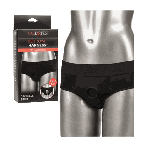 The Her Royal Harness™ Backless Brief is an ultra-comfortable harness fashioned like a risqué backless brief with powerful performance and comfort in mind. This bold harness has an extra-wide waistband, soft stretchy fabric and reinforced O ring for the ultimate support. The durable, reinforced O-ring stretches to accommodate your favorite probe, packer, vibrator or dildo. With a form-fitting design, this comfort harness can be worn discreetly under clothes. Enjoy pleasure made for two with the double panel interior for easy access to your favorite probe. Beginners and expert users alike will love frustration-free pleasure with this easy-to-wear harness. Simply secure your favorite probe, slip into the bold backless brief and dive deep into passionate penetration or enjoy comfortable all-day wear. Enjoy easy clean up by machine washing and hanging to dry. Size 2XL to 3XL