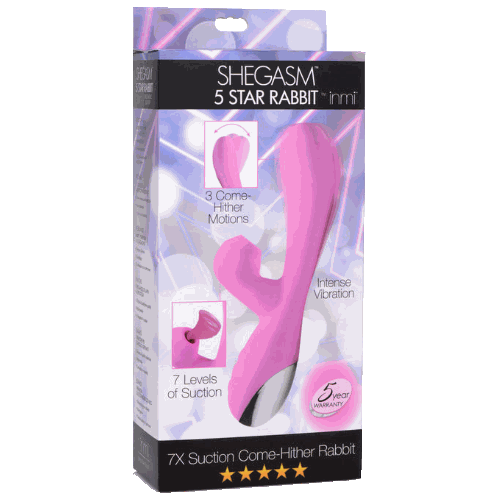Get ready for the 5-Star Come Hither treatment! This intense rabbit vibe simultaneously provides powerful pleasure directed at your G-spot and clitoris. The curved tip grinds back and forth on your G-spot while the indulgent clit stimulator sucks and pulses on your fun button! Perfect for players who love forceful, versatile toys to fulfill their cravings.