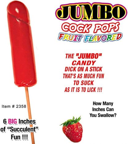 How many inches can you swallow? Well find out when you suck on one of our great tasting jumbo Fruit Flavored Pops Strawberry! These Jumbo Cock Pops not only taste great but have other valuable uses as well. They can be used as a weapon to knock any potential stalkers out they can cause hysteria when attempting to swallow them by any on looker’s within site or they can be simply sucked on until gone to improve one’s Oral skills thus enhancing your partners pleasure 10 fold during your next oral encounter! Adult candy, Bachelorette party favors, Halloween Treats.