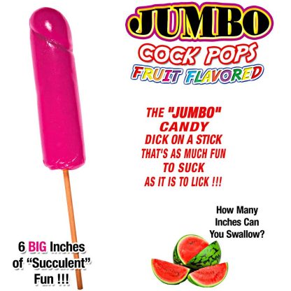How many inches can you swallow? Well find out when you suck on one of our great tasting jumbo Fruit Flavored Pops Strawberry! These Jumbo Cock Pops not only taste great but have other valuable uses as well. They can be used as a weapon to knock any potential stalkers out they can cause hysteria when attempting to swallow them by any on looker’s within site or they can be simply sucked on until gone to improve one’s Oral skills thus enhancing your partners pleasure 10 fold during your next oral encounter! Adult candy, Bachelorette party favors, Halloween Treats.
