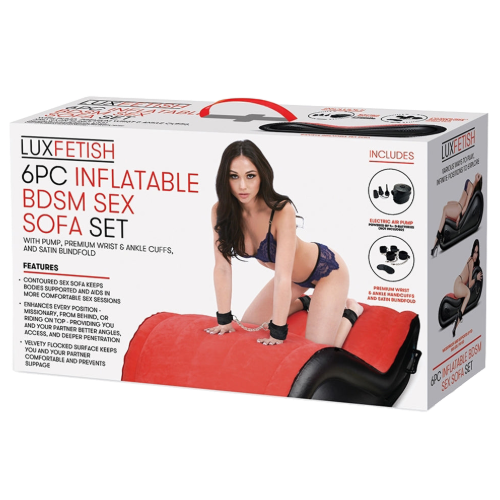 The 6-Piece Inflatable BDSM Sex Sofa Set features everything that you need to enhance couples play with kinky bondage play and a versatile piece of furniture that will allow you to try sex in exciting new positions. Featuring an erotic color combination of red and black, this inflatable bed lures you onto its velvety soft surface with its sensual curves. Explore the pleasurable satisfaction of experimenting with restraint play with the included set of wrist and ankle cuffs that are included. The easy to use cuffs are beginners friendly and the perfect introduction to BDSM play for beginners. Comfortably let go of control as you lay back and relax and allow your dominant partner to take over as you submit to their stimulating touch. This set allows you to create your own at-home dungeon with its convenient design that can be inflated at a moment’s notice whenever the sexy mood hits, and can also be deflated when playtime is over.
