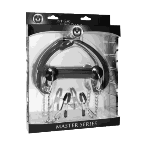 Tease your plaything with this dual featured Silicone Bit Gag + Nipple Clamps. Affixing the bit gag over your playthings open mouth and securing it by way of the sturdy, adjustable silicone belt style strap. The back closes with a standard rolling buckle, and offers full adjustment. The gag is made of premium silicone and held securely in place by two metal O rings. This devious device is taken up a notch with the addition of two connector chains that feature two adjustable pressure, Alligator style nipple clamps. These clamps are great for varied pressure play. The tips are vinyl coated for comfort and adjust with the screw located at the tips. Once these are affixed to the nipples of your plaything, you can control just how much pleasure or pressure they deserve. Simply adjust the level of intensity by turning the screw located near the tip of the clamp. Oh the possibilities…