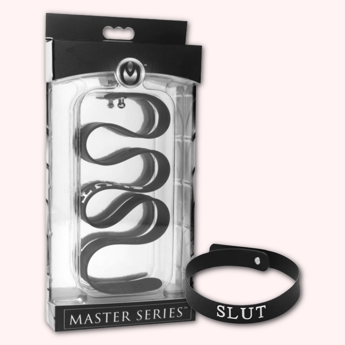 Claim your submissive with this high quality silicone collar from the Master Series. This comfortably slender silicone collar is adjustable, to ensure a snug fit. The collar makes the ultimate statement, with the word SLUT simply stated on the front in raised white silicone letters. Adjustable notch closure in the back. Ideal for a night out, or a naughty BDSM session…
