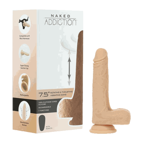 If you want a crazy, unparalleled experience, the search is over! Introducing the latest addition to the Naked Addiction family! At our headquarters, we call this one “The Freak” because it moves unlike any other rotating, vibrating or thrusting dong in the line. How so? Because when was the last time you saw a dong that can do all three simultaneously!? Standing tall at 7.5 inches with an insertable length of 6.2 inches, this dong carries out many signature traits of the Naked Addition line. It’s made from 100% IncrediFeel Platinum Cured Silicone with realistic texture and powered by our infamous PowerBullet technology. Use confidently when attached to any surface by the strong suction base or attach it to almost any harness with ease! Safety is a priority of ours and we want you to know that this product is made from body-safe materials and is phthalate and latex free. When you’re finished using your product, you can clean it off easily with a toy cleaner or soap and water. Be more in control of your pleasure by using the included remote to switch between rotations and thrusting movement to vibrations. When it’s time for a battery recharge, conveniently use the provided USB cable to charge it up anywhere, anytime! Combined with original rotating and thrusting movements, this dong is sure to spice up any hot and heavy occasion! You will notice, however, that your new dong will find a new “pose” every time it stops, so don’t be alarmed if it does not go back to the same position it was in when you started. After all, we do call it “The Freak” for a reason! Key Features: • Realistic Texture • 7 Dynamic Functions • Included Remote Control • Intense PowerBullet Vibrations • Combined Rotating, and Thrusting Movements • Strong Suction Base • Compatible with Most Harnesses • Travel lock Material: 100% Platinum cured IncrediFeel silicone USB rechargeable, cord included. Charge Time – 2 hours Run Time – 1 hour Dimensions: Overall Length – 7.5 inches Insertable Length – 6.2inches Diameter – 1 inches
