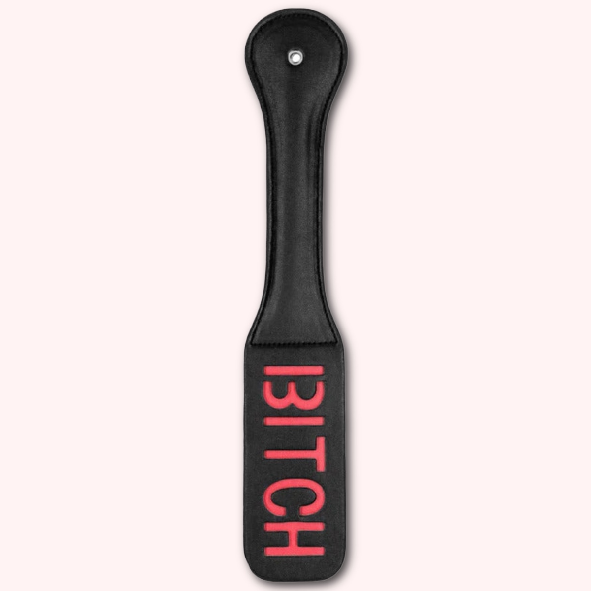 Ouch! Paddle – BITCH – Black. Leave a lasting impression on your sub. The word BITCH is reversed so it will show up on their skin. Made of firm but flexible stitched leather.