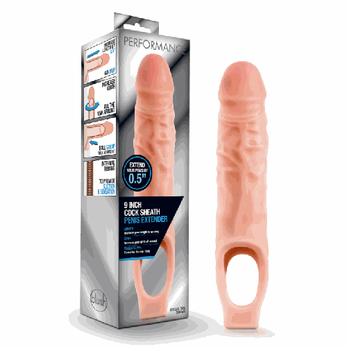 The Performance 9 Inch Cock Sheath is soft and lifelike for a realistic feel—just like your shaft, but bigger. The internal ribbing creates suction that holds the sheath securely on and delivers extra sensation to the wearer. Just insert your penis into the Performance 9 Sheath and then slide your testicles through the ball strap. This girthy sheath is perfect for extending your playtime. Made of premium TPE, it’s body safe and easy to clean.