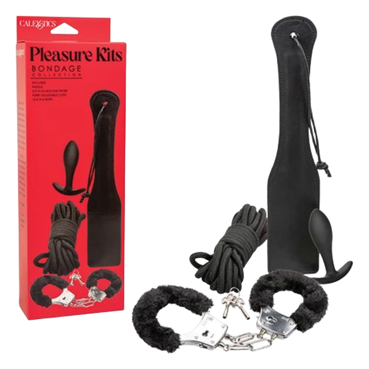 Step into a world where control meets comfort with the Pleasure Kits Bondage Collection, a curated set designed to enhance every aspect of your bondage play. This collection features a sturdy, double-stitched paddle for those who love a good spank, a smooth, tapered silicone probe for delightful placement stimulation, removable faux fur cuffs for soft yet firm restraint, and 16.5 feet of rope for the ultimate binding experience.