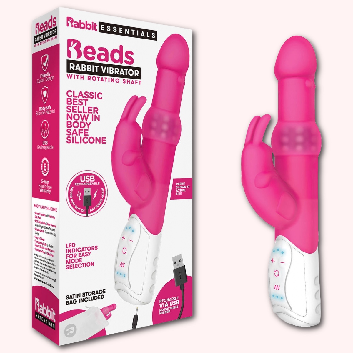 ndulge in utter delight with the Beads Rabbit Vibrator with Rotating Shaft. This premium, classically styled vibrator has 7 functions and is a multi-speed, multi-direction pleasure toy. The textured, grippable base has LED display for easy button selection when the lights are off. The bottom hides a convenient rechargeable port via USB so that battery usage is never a concern. The Beads Rabbit Vibrator with Rotating Shaft is made from incredibly smooth, latex and phthalate-free body-safe silicone and is easy to clean for endless use. This well-designed vibrator has beads along its shaft to produce unbelievable arousal and a realistic tip for natural feel and stimulation. This pristine product also comes with a beautiful satin storage bag to keep your vibrator in between pleasure sessions. The storage bag and travel lock make it perfect for travel.