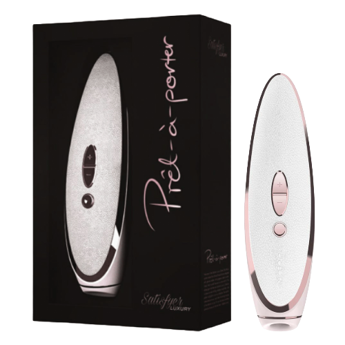 This luxury gem is designed with precious detail in mind. Featuring materials such as white leather, rose-gold accents, and soft medical grade silicone, this toy offers a refined touch for your cultivated taste and clitoral satisfaction.