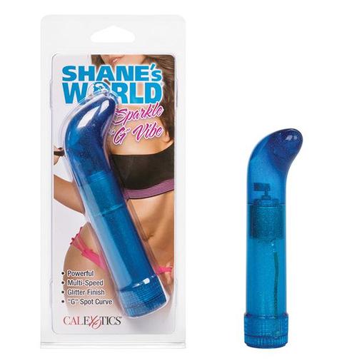 Shane’s World Sparkle G Vibe is a smooth, seamless, glitter finished G-spot massager. Features multiple speeds and a G-spot curve. Made from ABS. Requires 1 AA battery. From Cal Exotics. Measurements: 4.5″ X 1.5″.