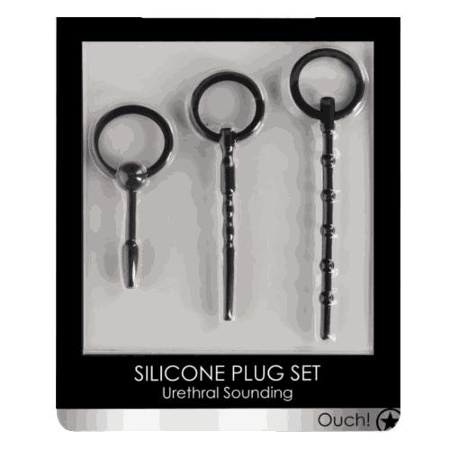 The OUCH! Urethral sounding Plug Set is comprised of 3 phthalate-free high-grade smooth medical silicone dilators, which can be used incrementally for urethral play. They can be used to create immense stimulation and to gradually open up new realms of pleasure. These flexible, textured dilators can produce incredible sensations and help build up strong erections and powerful orgasms. They are ideal for BDSM play and especially for creating medical play experiences. Each of the dilators has a different size and texture for added sensation and a gentle transition from one size to the next. See specifications for exact sizes on the box. The ring pull design offers the security of easy removal. Warning: If not conducted carefully, sounding carries a risk of irritation, tearing of the urethra, or of urinary tract infectio