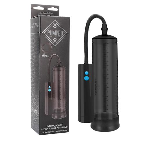 The PUMPED line is here to impress with a fantastic assortment of penis enhancing devices! Clinical studies have proven that vacuum erection devices will give instantly harder erections, cause temporary flacid enlargement and can increase permanent penis augmentation. According to the American Urological Association, these devices may also be useful in cases where such PDE5 drugs as Viagra have failed to work! Doctors view the penis pump as a safe, effectual and cost effective treatment for erectile dysfunction and state that the prolonged use of these devices will enhance the size of the penis permanently. Other advantages of the PUMPED selection are, amongst others, delayed ejaculation, improvement of sexual appetite, boosting of testosterone, the maintenance of longer and harder erections and the supporting of penile tissue after prostate surgery. PUMPED, for instant results! With a total cylinder length of 25cm (9.6″) and a diameter of 7cm (2.76″), this high-quality pump gives you ample possibilities to grow in both directions! The total length of the hose is 21.5cm (10″) and the insertion sleeve is made of smooth Silicone. Surprise yourself every time on how big you can get! At the touch of a button, the extremely powerful rechargeable pump will create a super strong vacuum, giving you a quick and powerful erection. The soft silicone opening will create a tight yet comfotable seal.