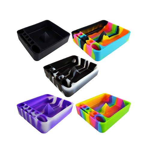 Ashtray made from 100% food grade silicone and will not melt or burn. Has built in pyramid pipe debowler for glass friendly tapping and specialty slots for lighter, cigarettes, cigar, rolling papers, pipe tool and filters. Assorted colors including surprise glow in the dark styles.