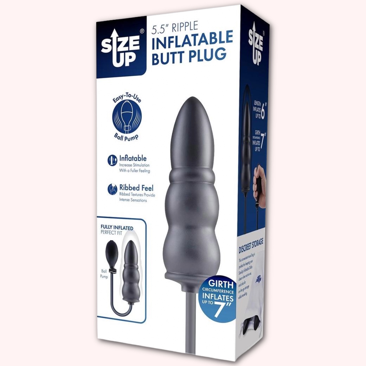 Pump-up your play! Intensify anal play with a ribbed, inflatable design that inflates up to a sizeable 7” in girth and features a quick-release valve for easy control. Enjoy extra stimulation with the SizeUp Ripple Butt Plug’s ribbed textures, offering added internal pleasure. Once fully inflated this butt plug can increase to a length of 6″ and girth of 7″.