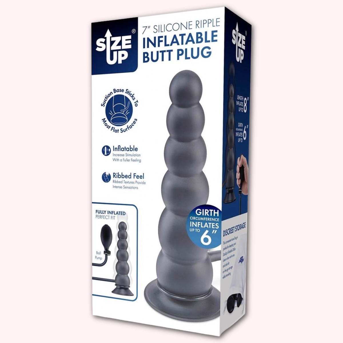 Pump-up your play! Enjoy every bead of this 7″ silicone ribbed butt plug that’s equipped with a sturdy suction cup base and quick-release valve for customizable, hands-free pleasure. Enjoy extra stimulation with the SizeUp Silicone Ripple Butt Plug’s ribbed textures, offering added internal pleasure. This ripple but plug increases up to 8″ in length and 6″ in girth when fully inflated.
