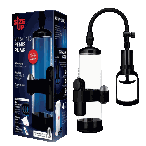 Our Vibrating Penis Pump set has everything you need to deliver a powerful and pleasurable erection. The sturdy, roomy chamber goes around the penis to create a sealed vacuum around it. Use the trigger grip to control suction and release at your choosing. The soft seal is comfortable against your skin as you’re pumping, while the vibrating bullet adds stimulation.