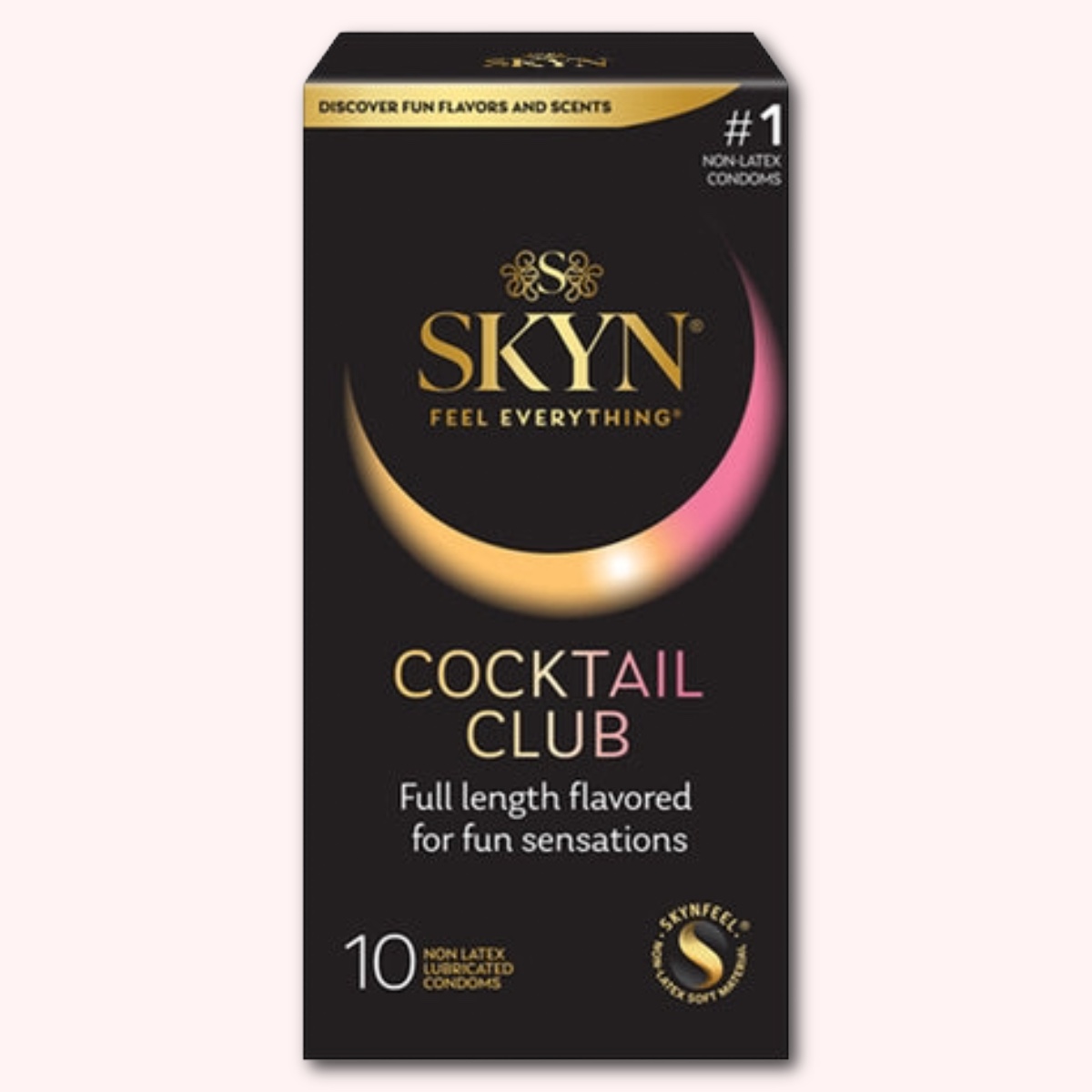 SKYN® Cocktail Club Lubricated Condoms are made with SKYNFEEL® material, a non-latex material that feels soft and natural. These full-length condoms are flavored and scented in Piña Colada, Cherry Sunrise, and Passion Daiquiri. All SKYN® condoms are free from natural rubber proteins, making them a suitable choice for people with known or suspected latex allergy.