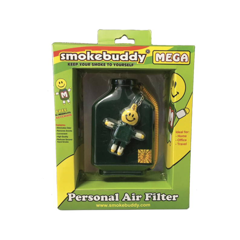 Smokebuddy MEGA Personal Air Filter Smokebuddy MEGA is our newest smokebuddy. Designed with a filter twice as large as the Original Smokebuddy. The flat shape fits in your hand and looks great. Every Smokebuddy MEGA includes a MEGA size Mr. MegaBuddy LED keychain that will light up when you squeeze him.Smokebuddy MEGA will last the heavy users months and possibly years. The Smokebuddy MEGA is a handy, and reliable, life saving air filter. Simply exhale your smoke through your easy-to-use Smokebuddy MEGA and odorless air comes out the other end. Smoke where you want, and when you want without anyone knowing the wiser. Keep second hand smoke away from friends, family, and neighbors with your Smokebuddy MEGA. Includes – Smoke Buddy Keychain with LED light – Travel Caps Included for storing discreetly – Environmentally friendly product – Keeps second hand smoke away from friends, family, and neighbors – Magically removes smoke and odor – Estimated at 600 uses or more
