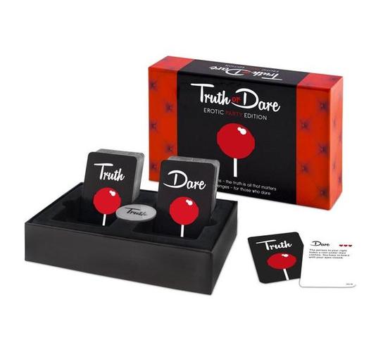69 questions – the truth is all that matters. 69 challenges – for those who dare. The makers of the internationally beloved erotic game Discover Your Lover have now put an erotic spin on the famous game of Truth or Dare! The game contains 69 spicy questions and 69 provocative dares. It’s bold, naughty and exciting! Truth or Dare can be played by 3 or more friends. Toss the included chip to determine which kind of card you draw. On a TRUTH card, you only earn points for an honest answer—the more detailed, the better. On a DARE card, you earn points by completing the provocative challenge. Did you draw a question or dare you really don’t want to answer or do? No problem—but the points for that card are subtracted from your score. Anything goes, but nothing’s a must. How far do you all dare to go? Play Truth or Dare Erotic Party Edition with your friends (18+) just before you hit the town, at a party or whenever your group wants a little spice and sensation. This hot-blooded game guarantees a candid and fun-filled time. If you’re playing for points, decide beforehand what the winner can expect (from the loser).