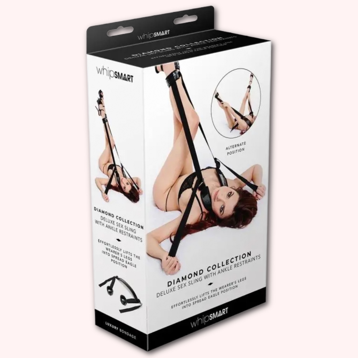 The Diamond Body Sling is a couples’ play essential bedroom accessory. This comfortably padded neck strap is attached to padded ankle cuffs that easily buckle on for effortless use. Pull on the attached straps to enable you to find the perfect — and effortless — positioning for missionary sex or oral play.